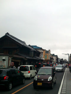 古い町並みには、車の渋滞、いたるところにサツマイモの加工品。