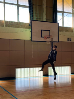 小学校のバスケットゴールは低いのでこんなことも出来ちゃう。