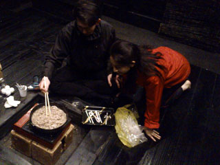 囲炉裏で、すき焼き風肉鍋。