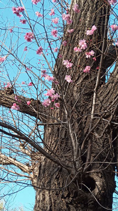 某池のイチョウに寄生して咲く桜。